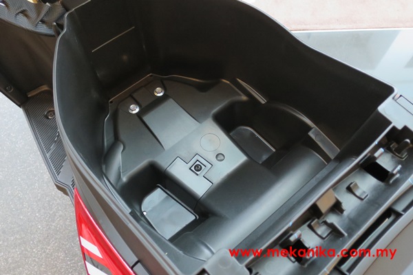 Ruang penyimpanan barang seluas 14 liter membolehkan penunggang menyimpan topi keledar dan barangan lain tanpa sebarang masalah.