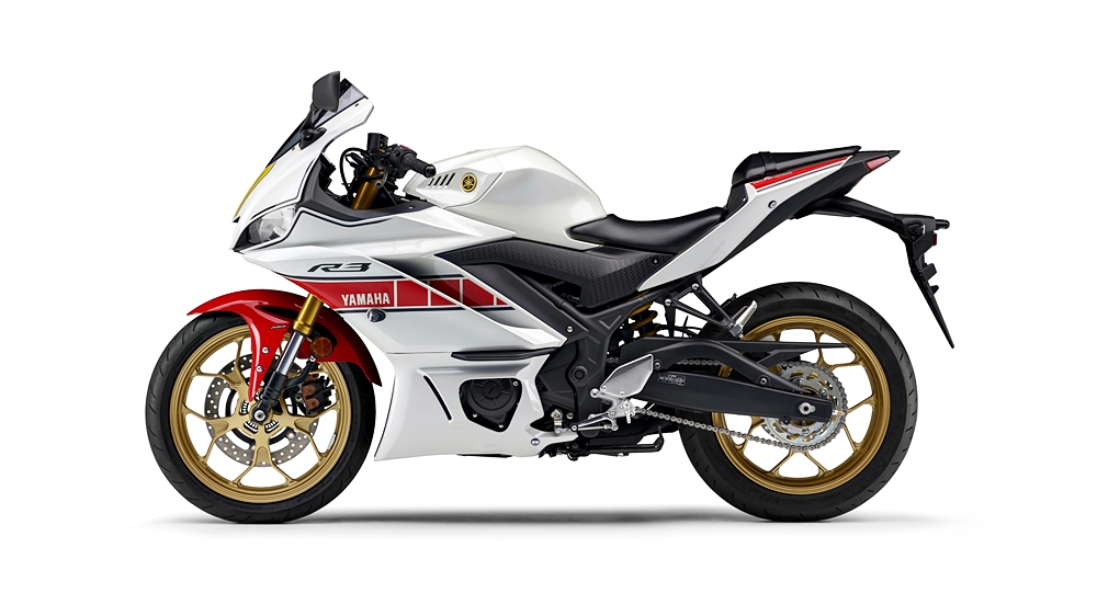 Selain skema warna badan merah putih, YZF-R3 ABS WGP 60th Anniversary juga menonjol dengan warna emas pada fork depan dan roda 17 inci.